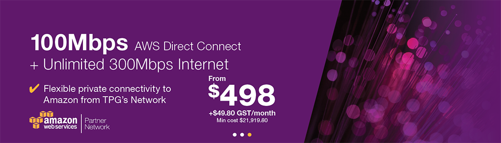 Virtual Data Centre Private connectivity to your TPG Virtual Data Centre or AWS National AWS Connect Flexible private connectivity from 10Mbps to 10Gbps to Amazon from anywhere in Australia |
